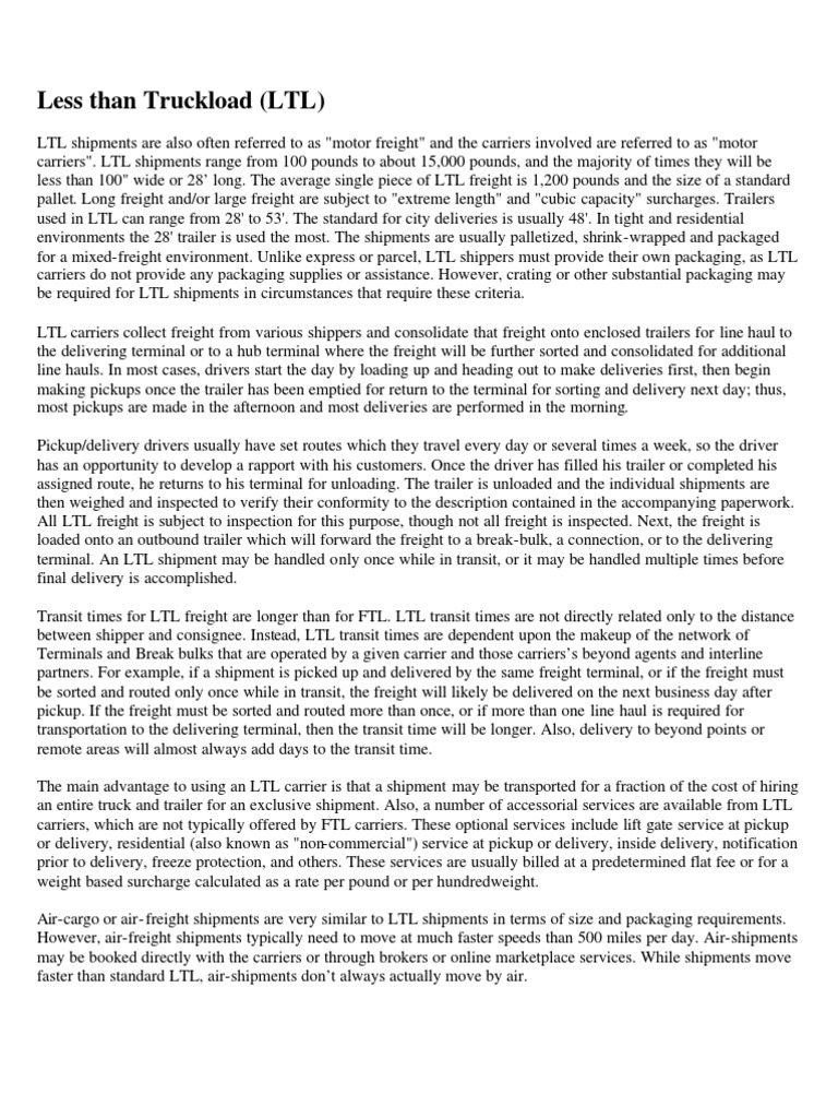 Course Title: LTL (Less-Than-Truckload) Trucking and US Government Traffic; It Ain’t Easy! Abstract: LTL carriers specialize in transporting shipments weighing from 150 pounds to 10,000 pounds. Since individual shipments do not often fill up an entire trailer, LTL carriers operate terminal systems to consolidate and deconsolidate shipments. ... View Full Source